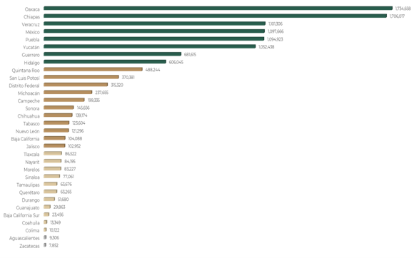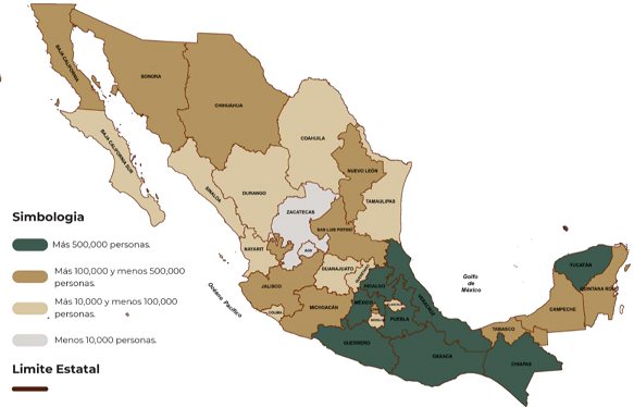 En México, la población indígena se encuentra presente en la cuarta parte de las localidades del país (64,172), casi en todos los municipios (2,417) y en todas las entidades federativas. Ocho entidades cuentan con más de 500,000 indígenas, que representan el 75 por ciento del total: Oaxaca, Chiapas, Veracruz, México, Puebla, Yucatán, Guerrero e Hidalgo(9).