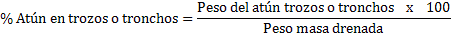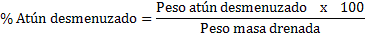 d) Expresar el peso del atún desmenuzado como porcentaje (%) de la masa drenada.