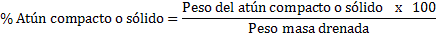 a) Expresar el peso del atún compacto o sólido retenido en la criba mediante una resta y expresarlo como porcentaje (%) del peso masa drenada.