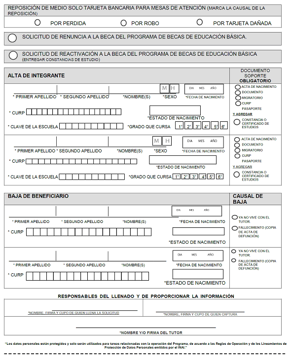 Los datos personales incluidos serán protegidos, incorporados y tratados por la Coordinación Nacional de Becas para el Bienestar Benito Juárez, con fundamento en los artículos 3, fracciones II, XXVIII, XXXI, XXXIII, 16, 17, 18, 20, 21, 22, 25, 26, 65, 66 y 70 de la Ley General de Protección de Datos Personales en Posesión de Sujetos Obligados, considerando lo dispuesto en el aviso de privacidad integral, mismo que se encuentra disponible en el siguiente sitio: https://www.gob.mx/becasbenitojuarez/documentos/aviso-de-privacidad-integral-175341