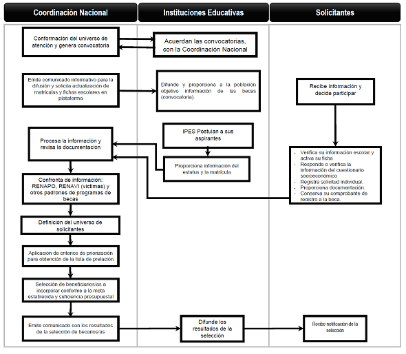 | 3. Solicitud de apoyo y entrega de información | Con base en lo establecido en la etapa anterior: · Las IPES proporcionan (i) a la Coordinación Nacional, información sobre su matrícula; y, (ii) aquella documentación escolar que les sea requerida por la Coordinación Nacional para participar en la convocatoria que corresponda. Lo anterior, a través del mecanismo definido para ello en la etapa 2. Las IPES son las responsables de integrar y resguardar el expediente de cada solicitante que reporten como inscrito ante la Coordinación Nacional, así como de postular, en su caso, a sus estudiantes de acuerdo con la información contenida en dichos expedientes. ... ... En caso de que el registro de la solicitud se realice en línea, deberán proporcionar la información que les sea solicitada. En caso de que algún/a solicitante no se encuentre registrado en la matrícula reportada por su IPES o detecte inconsistencias en su información, deberá acudir a la oficina de Control Escolar o su equivalente del plantel educativo para la actualización correspondiente, misma que la IPES proporcionará a la Coordinación Nacional. ... Toda la información que tanto las IPES como los/las solicitantes proporcionen a la Coordinación Nacional deberá ser vigente, completa, correcta y veraz. | IPES Solicitantes |