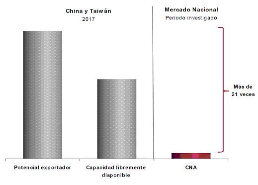 484. Los resultados descritos en los puntos anteriores sustentan que China y Taiwán cuentan de manera conjunta con una capacidad libremente disponible y un potencial exportador, considerables; en relación con la producción nacional y el tamaño del mercado mexicano de la mercancía similar, por lo que una desviación marginal de sus exportaciones podría ser significativa para la producción y el mercado mexicano.