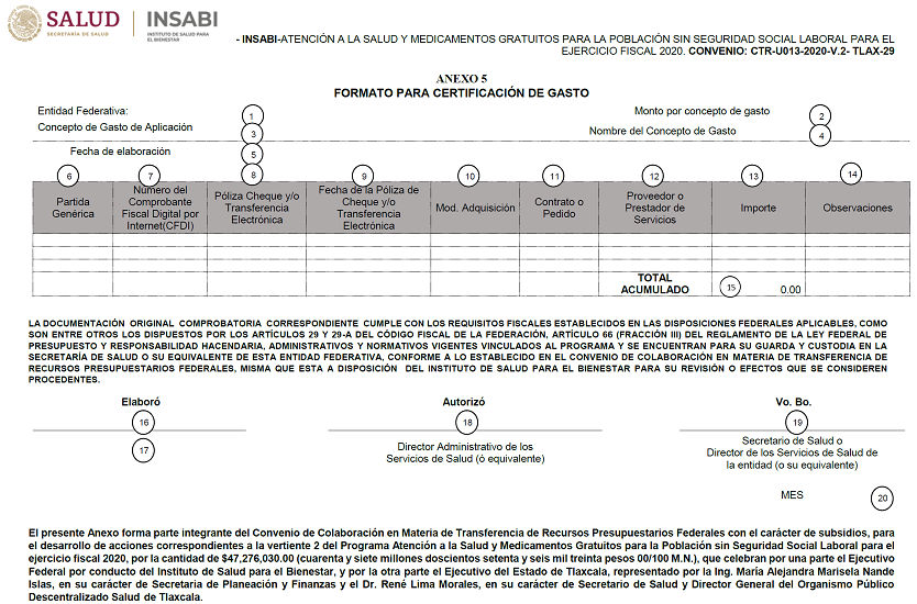 El presente Anexo forma parte integrante del Convenio de Colaboración en Materia de Transferencia de Recursos Presupuestarios Federales con el carácter de subsidios, para el desarrollo de acciones correspondientes a la vertiente 2 del Programa Atención a la Salud y Medicamentos Gratuitos para la Población sin Seguridad Social Laboral para el ejercicio fiscal 2020, por la cantidad de $47,276,030.00 (cuarenta y siete millones doscientos setenta y seis mil treinta pesos 00/100 M.N.), que celebran por una parte el Ejecutivo Federal por conducto del Instituto de Salud para el Bienestar, y por la otra parte el Ejecutivo del Estado de Tlaxcala, representado por la Ing. María Alejandra Marisela Nande Islas, en su carácter de Secretaria de Planeación y Finanzas y el Dr. Dr. René Lima Morales, en su carácter de Secretario de Salud y Director General del Organismo Público Descentralizado Salud de Tlaxcala.