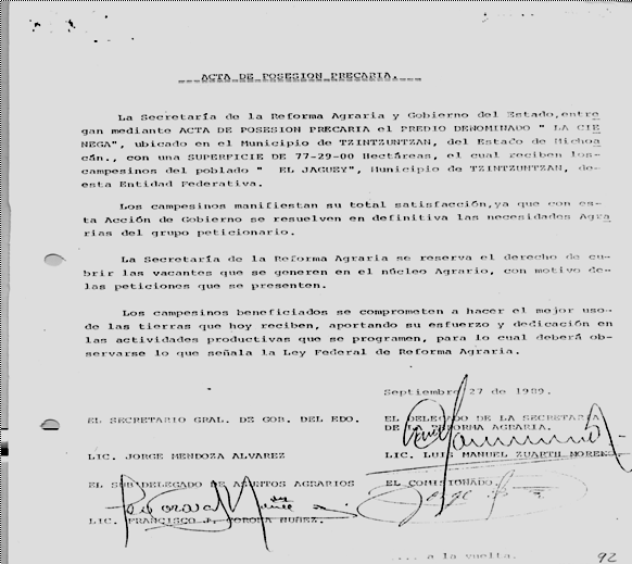 "...I.- La denuncia de simulación de fraccionamiento aquí practicada, a medida de incidente, en contra de los CC. Eugenio Arriaga Vélez, Luis G. Arriaga Vélez, Rafael y Sergio Arriaga, así como el C. Eugenio y Augusto Arriaga Mayés, fue desatendida durante el procedimiento por parte de los denunciantes motivo por el cual no lograron comprobar todas y cada una de las manifestaciones hechas en asamblea convocada en el poblado de "EL JAGUEY, municipio de Tzintzuntzán, Mich., cuyos resultados se dejan anotados en el acta que adjunto, la cual carece de las firmas de parte del grupo solicitante, ya que una vez terminada esta diligencia se negaron a firmar sin razón alguna.