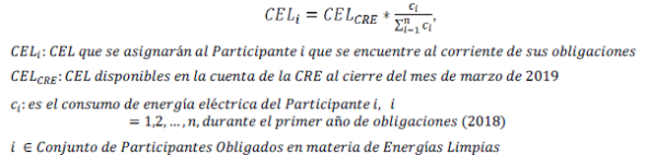 De conformidad con lo descrito en el numeral anterior, el criterio para la asignación de CEL disponibles en la cuenta de la Comisión, consiste en una prorrata del consumo que representa cada Participante Obligado en proporción al consumo total, tal como se describe en la siguiente fórmula: