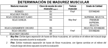 | 5. | Asociación Mexicana de Engordadores de Ganado Bovino, A.C. | Respecto al numeral 6.6.1.2 el promovente opina lo siguiente: "Solicitamos agregar una tabla que señale los colores, claves y texturas de cada grado básico de calidad con el fin de dar claridad para los proveedores y consumidores". Por lo cual, el promovente envía la siguiente propuesta para la determinación de madurez de la carne: "6.6.1.2 MADUREZ MUSCULAR En la madurez muscular se evalúa el color y textura de la carne del músculo largo del dorso. El color de la carne se intensifica a un tono más oscuro y la textura se vuelve más irregular con los avances correspondientes de edad, de acuerdo con la siguiente TABLA: ![]() " | SE ACEPTA | Con fundamento en los artículos 47 fracción II, y 64 de la Ley Federal sobre Metrología y Normalización, los miembros del Comité Consultivo Nacional de Normalización Agroalimentaria a cargo de la Secretaría de Agricultura, Ganadería, Desarrollo Rural, Pesca y Alimentación, analizaron el comentario y, por consenso, decidieron aceptarlo y agregar la propuesta de tabla en el Proyecto de NOM, de acuerdo a la propuesta hecha por el promovente. |