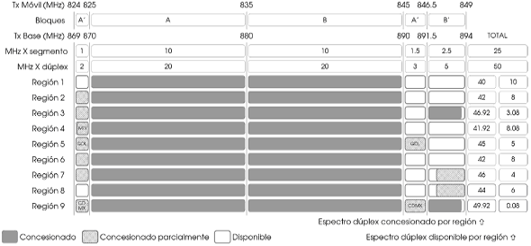 | Consideraciones adicionales: | Su concesionamiento se encontrará sujeto al espectro disponible en esta Banda de Frecuencias, mismo que deberá especificarse en el correspondiente proceso de licitación. |