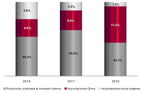 231. Por su parte, la participación de la producción nacional orientada al mercado interno de la rama de producción nacional aumentó 2 puntos porcentuales en periodo analizado; creció 3.5 puntos porcentuales en 2017, pero perdió 1.5 puntos porcentuales en el periodo investigado. Estos resultados indican que las importaciones originarias de China fueron las que se beneficiaron del crecimiento relativo del mercado nacional.
