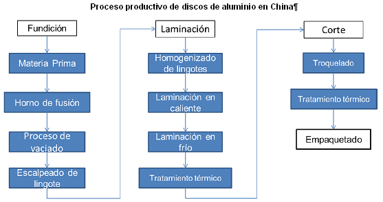 11. Los principales insumos para fabricar el producto objeto de investigación son el aluminio, la chatarra interna de aluminio, electricidad y gas. El proceso de producción consta básicamente de cinco etapas: i) fundición; ii) laminación; iii) corte; iv) tratamiento térmico, y v) empaquetado: