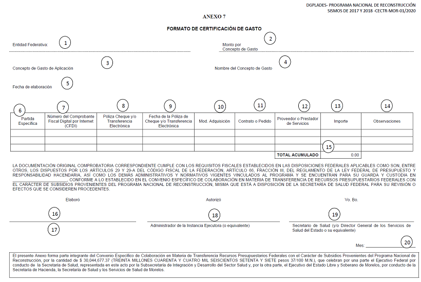 NOTA: ES IMPORTANTE MENCIONAR QUE DEBERÁ EMITIRSE UN FORMATO DE CERTIFICACIÓN DE GASTO POR CADA CONCEPTO DE GASTO COMPROBADO (EJERCIDO), ASÍ COMO PARA EL CASO DE ECONOMÍAS Y LOS RENDIMIENTOS FINANCIEROS, DE ACUERDO AL EJERCICIO DE LOS RECURSOS ASIGNADOS A LA ENTIDAD FEDERATIVA.