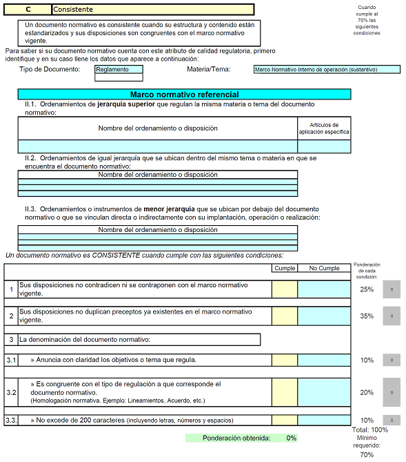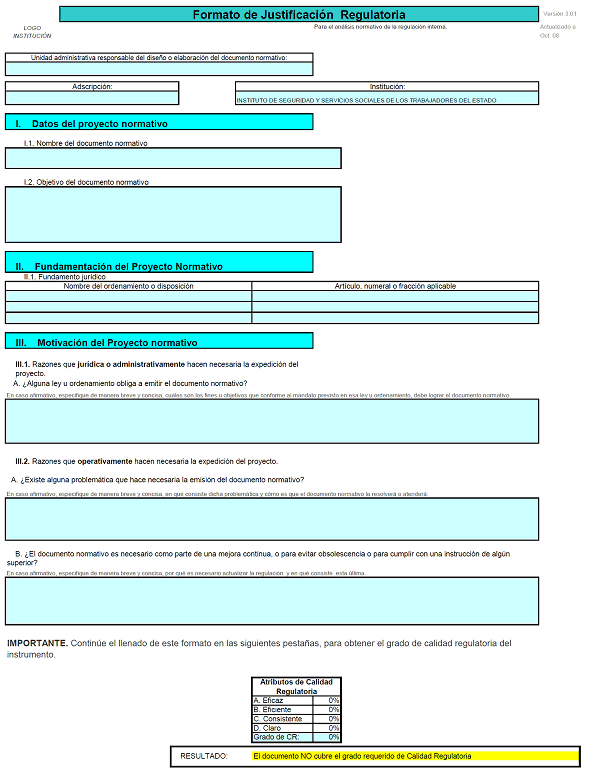 XI. Formato de Justificación Regulatoria: Documento que requisita el área proponente para demostrar que el instrumento normativo cumple con los atributos de eficacia, eficiencia, consistencia y claridad, el cual es verificado por el Órgano Interno de Control en el ISSSTE;