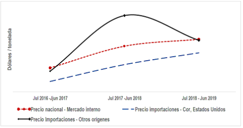 c. el precio promedio de las importaciones investigadas, en condiciones de discriminación de precios, fue menor que el nacional, en porcentajes de 10%, 12% y 8% en los periodos julio de 2016-junio de 2017, julio de 2017-junio de 2018 y julio de 2018-junio de 2019, respectivamente.
