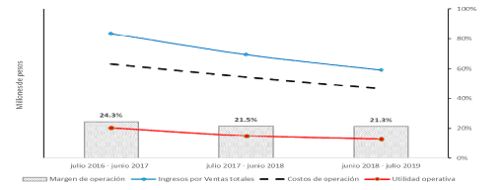 281. En cuanto al estado de costos, ventas y utilidades de Mexichem, que corresponde a las ventas de DOP en el mercado de exportación, la Secretaría observó que, en el periodo julio de 2016-junio de 2019, los ingresos que resultan de estas ventas se redujeron 33%, y los resultados operativos 34%, en tanto que el margen de operación observó un retroceso de 0.46 puntos porcentuales.
