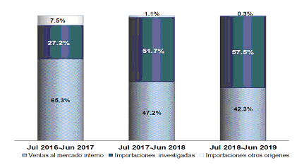 a. disminuyeron 85% en el periodo julio de 2017-junio de 2018 con respecto al periodo anterior comparable, y 77% en el periodo investigado, lo que significó una caída del 97% durante el periodo analizado. Asimismo, estas importaciones pasaron de representar el 22% de las totales en el periodo julio de 2016-junio de 2017, a ser prácticamente inexistentes en el periodo investigado, cuando contribuyeron con el 0.5%, y