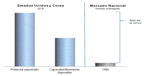 b. el potencial exportador de ambos países, calculado como capacidad instalada menos consumo, se incrementó 12% de 2016 a 2018, al pasar de 507 mil a 568 mil toneladas, volumen que equivale a más de 14 veces el tamaño del mercado nacional, y más de 20 veces la producción nacional en el periodo investigado.