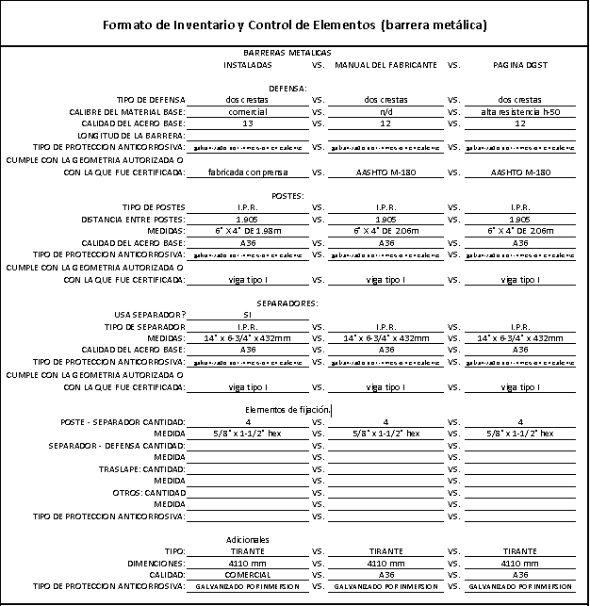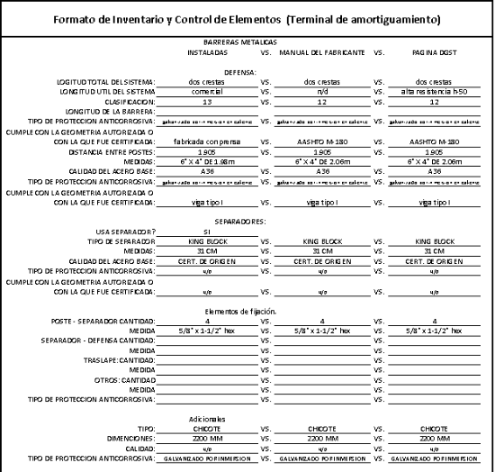 | Luis Edgar Quiroz Alvarez, Representante Legal Manufacturas Carmen, S.A. de C.V., 10 de agosto de 2020 | 68 | Dice: 9. Conservación Los responsables de la conservación de las carreteras o de las vialidades urbanas, deben asegurar que las barreras de protección de los tramos a su cargo, incluyendo sus barreras de transición y secciones extremas, siempre funcionen correctamente, por lo que deben implantar un programa de inspección y conservación rutinaria y, en su caso, proceder a reparar o reemplazar inmediatamente los elementos que resulten dañados por un percance o por vandalismo, para evitar que un vehículo se impacte en un elemento estropeado que pudiera incrementar la gravedad del accidente, pues una barrera dañada se convierte en un obstáculo muy peligroso para los usuarios. Conforme con lo establecido en el inciso 5.3.1, siempre que sea necesario reponer o reemplazar una barrera deberá revisarse el nivel de contención de las barreras de protección en función de la composición del flujo vehicular en términos del TDPA y de la velocidad de operación que se esperen en los siguientes cinco (5) años en el subtramo donde se ubique dicha barrera o parapeto. Los trabajos de inspección, conservación y reparación o reposición se deben realizar considerando lo siguiente: Durante los trabajos de conservación, de reparación o de reemplazo, se debe prestar especial atención al señalamiento y dispositivos de protección conforme a lo establecido en la Norma Oficial Mexicana NOM- 086-SCT2-2015, "Señalamiento y dispositivos para protección en zonas de obras viales", para no generar otro incidente derivado de esos trabajos. Comentario: Para poder conservar y garantizar que las barreras de protección de los tramos a su cargo, incluyendo sus barreras de transición y secciones extremas, siempre funcionen correctamente las áreas de conservación deben conocer por lo menos, las características y especificaciones de los productos nuevos que se instalan en los diferentes tramos a conservar por lo que se sugiere el uso de un formato de inventario y control de elementos que deberá ser llenado por el residente con la información proporcionada por el fabricante vs. los materiales instalados vs. la información contenida en la pagina de la DGST de Dispositivos de Seguridad Autorizados, ademas del uso forsoso de manual de instalación del fabricante; Dado que dicha informacion está en manos de la DGST de la SCT desde el momento en que dichos sitemas son autorizados, adicional a lo mencionado en el punto 13.1 de está norma . SE ANEXAN FORMATOS TIPO EJEMPLO (ver páginas siguientes) | El espíritu del inciso 9.4 Almacenamiento, es que la autoridad responsable de la conservación de la calle o carretera o en su caso el concesionario, cuente con la suficiencia de recambios de los componentes que integran cada tipo de barrera, con el propósito de llevar a cabo la reparación o reposición de la barrera de forma inmediata, sin demora, que permita devolver la integridad de la misma al 100%. Emplear un formato de inventario y control de elementos que deberá ser llenado por el residente con la información proporcionada por el fabricante vs. los materiales instalados, como propone el promovente, puede ser una buena práctica, sin embargo, no es propósito del proyecto de NOM precisar si dicho control debe ser llevado a cabo mediante el uso de un formato de inventario. Se resuelve no procedente. | |