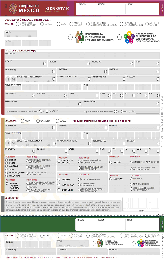 h) Las solicitudes de incorporación de las personas solicitantes y/o cualquier trámite relativo a la Pensión por las personas derechohabientes, será a través del Formato Único de Bienestar (Anexo 3), el cual deberá estar acompañado de la documentación señalada en el numeral 3.3.1 de las presentes Reglas de Operación.