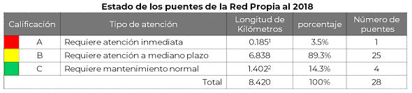 Por otra parte, se ha detectado un importante rezago en los servicios de mantenimiento y conservación, particularmente en la Red Propia, la cual presenta niveles bajos de servicio, en donde de los 28 puentes que conforman esta Red, el 89% de ellos requiere de mantenimiento en el mediano plazo, el 3.5% requiere de atención inmediata y el 14%, se considera necesario la implementación del mantenimiento normal, tal y como se observa en el cuadro siguiente: