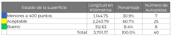 En lo que se refiere a la Red FONADIN, el rezago en el mantenimiento y conservación, depende de la asignación de los recursos que BANOBRAS otorgue para este fin, por lo que esta condición, ha complicado el cumplimiento a los programas de conservación asignados a esta Red, detectándose que siete autopistas, se encuentran con una calificación menor a los 400 puntos, esto con base en la evaluación realizada por la Secretaría de Comunicaciones y Transportes respecto del estado físico de las carreteras, la cual consiste en una metodología para calificar el grado de confort y seguridad al transitar por un camino a la velocidad de operación, asignando al camino una escala de 0 a 5 de cada uno de los elementos de la autopista, tales como: corona, drenaje, derecho de vía, señalamiento vertical, señalamiento horizontal, entre otras variables; por lo que en este sentido, la calificación total de la autopista se encuentra en un rango de 0 a 500, en la que el valor mínimo aceptable es de 400 puntos para un de tramo de 10 km-sentido.