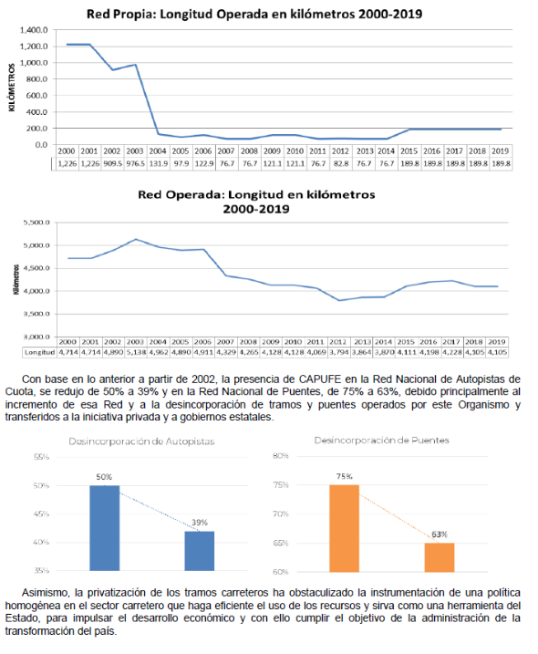 Por otra parte, las desincorporaciones de la Red Operada (Propia y FONADIN), han debilitado las funciones principales de operación y mantenimiento de CAPUFE, desaprovechando la experiencia de 62 años y la infraestructura instalada, así como la capacidad de transformarse y ofrecer más, y mayores de niveles de servicio en condiciones de competitividad, respecto a otros operadores privados, en beneficio de los usuarios.