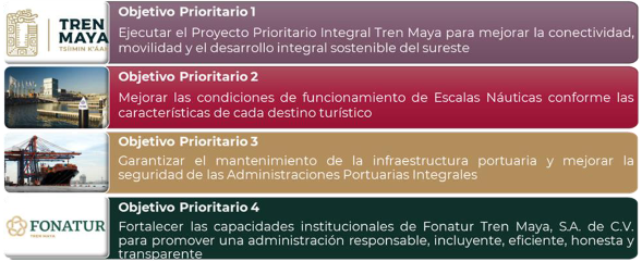 | Objetivo prioritario 3 Garantizar el mantenimiento de la infraestructura portuaria y mejorar la seguridad de las Administraciones Portuarias Integrales. | Objetivo prioritario 2 Impulsar el desarrollo equilibrado de los destinos turísticos de México. |