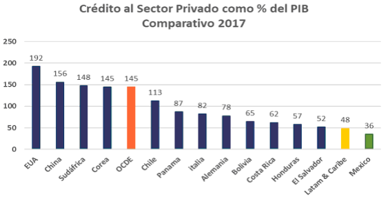 El sistema financiero mexicano pese a sus fortalezas en términos de capitalización y liquidez, no logra incrementar su nivel de penetración entre la población, al tiempo que no logra satisfacer las necesidades de financiamiento que requieren las empresas, especialmente las MiPyMEs, para el desarrollo del país. Un claro ejemplo es la baja penetración del crédito al sector privado como porcentaje del PIB, el cual solo representó el 36%, en cuanto que en países similares asciende al 48% y en países avanzados supera el 145%. La inclusión financiera en México presenta uno de los niveles más bajos a nivel internacional, inclusive uno de los más bajos en América Latina y el Caribe, a pesar de ser la segunda economía más grande de la región.