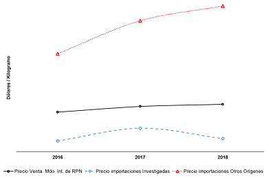 b. durante el periodo analizado el precio promedio de las importaciones de otros orígenes se ubicó por arriba del precio de las ventas nacionales al mercado interno, al pasar de 1.8 veces en 2016 a 2.2 veces en el periodo investigado. En relación con el precio de las importaciones investigadas, en los mismos periodos fue mayor en 2.9 y 3.8 veces, respectivamente.