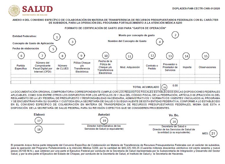 | 9 | Póliza Cheque y/o Transferencia Electrónica del pago efectuado | | 20 | Secretario de Salud o Director de los Servicios de Salud de la entidad (o su equivalente). |