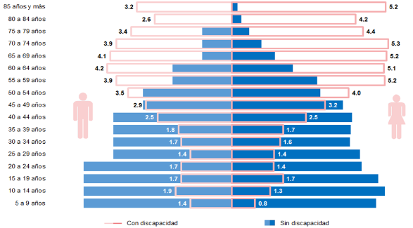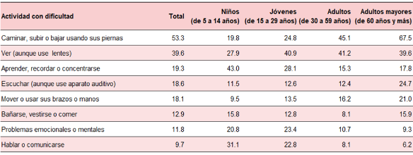 11 Las actividades consideradas son: caminar, subir o bajar usando sus piernas; ver (aunque use lentes); aprender, recordar o concentrarse; escuchar (aunque use aparato auditivo); bañarse, vestirse o comer y hablar o comunicarse.