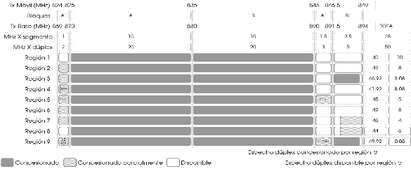 | Consideraciones adicionales: | Su concesionamiento se encontrará sujeto al proceso de reordenamiento de esta Banda de Frecuencias(22). |
