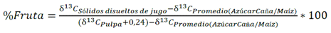 - Si la diferencia numérica δ13CVPDB en pulpa - δ13CVPDB en los sólidos disueltos es menor que 1, y los valores de la ä13CVPDB en sólidos disueltos y la pulpa se encuentran en los intervalos de las plantas C3 se puede considerar como un producto en el cual los sólidos disueltos provienen 100% de la fruta y se puede asumir como un jugo auténtico. En este caso, al aplicar la ecuación 4 resulta un valor de 98% o inclusive mayor al 100%.