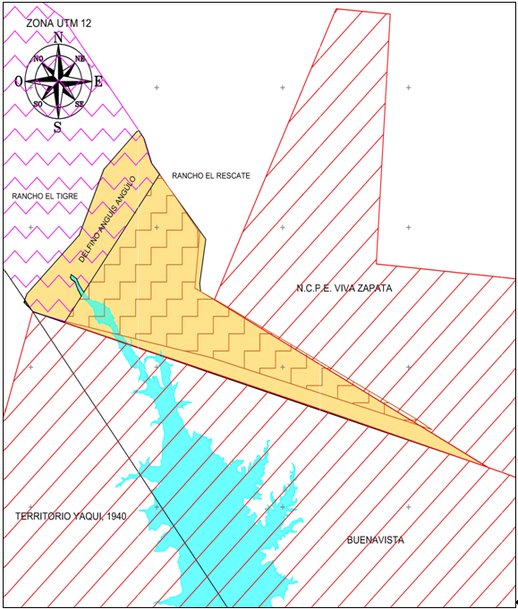 AL SURESTE: En 20 mts., con predio ( ), en posesión ( ) propiedad ( ) calle ( ) Río ( ) vereda ( ) Otro (X) de Territorio Yaqui en términos de la Resolución Presidencial del 22 de octubre de 1940.