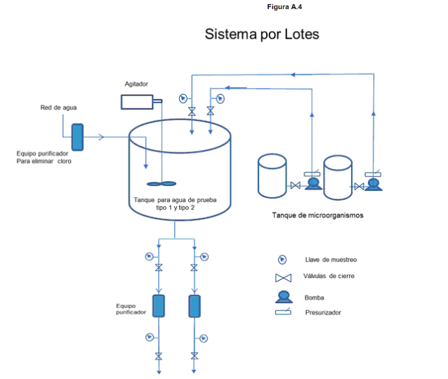 Para la realización de las pruebas se construirá una unidad piloto (Figura G.1 de esta Norma), en cuyo arreglo se empleará tubería de PVC hidráulico de ½". Tanques o tinacos con el volumen necesario para la operación continúa de 24 h al flujo establecido en el manual de operación del fabricante, que alimentara al equipo sometido a verificación mediante una bomba con los requerimientos teóricos de presión y flujo mínimo y máximo requeridos.