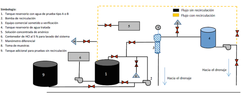 Finalmente, el arreglo hidráulico deberá permitir el lavado químico de la red utilizada entre cada equipo probado o para el caso de que se requiera verificar remoción de otro parámetro, seguido de un lavado con agua de la llave para eliminar cualquier residuo o impurezas desprendidas.