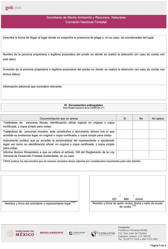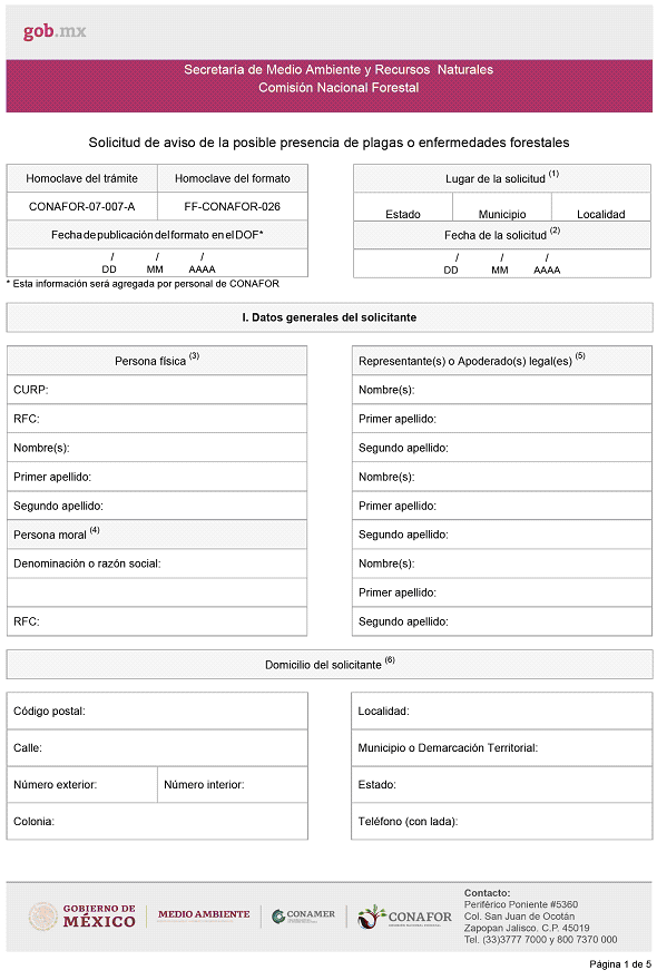 | CONAFOR-07-007-A | FF-CONAFOR-026 | Solicitud de aviso de la posible presencia de plagas o enfermedades forestales. | Formato de Solicitud de aviso de la posible presencia de plagas o enfermedades forestales. |
