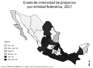 Adicional a la estrategia federal, es indispensable la vinculación con el ámbito local, pues es ahí donde se expresa la discriminación en la cotidianidad de la vida de las personas y la especificidad de la discriminación en cada entidad federativa, lo cual requerirá una estrategia diferenciada prevenir y eliminarla. Tal como lo muestra el grado de intensidad de prejuicios, que estratifica a las entidades federativas según la aceptación de los prejuicios que estudió la ENADIS 2017, en trece Estados, la población comparte en gran medida prejuicios xenofóbicos, homofóbicos, sexistas y de otras manifestaciones (grados muy alto y alto), en once se percibe un menor nivel de opiniones y actitudes discriminatorias (grado medio), mientras que en ocho Estados hay un mayor nivel de aceptación de las diversidades (grados bajo y muy bajo)(4).