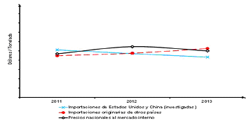"Considerando lo anterior, el precio promedio de las ventas internas de la rama de producción nacional, medido en dólares, registró un aumento de 16% en 2011 y disminuyó en 8% en el periodo investigado, acumulando un incremento de 7% en el periodo analizado. Asimismo, los resultados de la comparación del precio nacional y el precio de las importaciones investigadas indicaron la presencia de subvaloración en el periodo investigado: el precio promedio de las importaciones investigadas fue superior en relación con el precio nacional 10% en 2011, pero 13% inferior tanto en 2012 como en el periodo investigado. Tal como se observa en la Gráfica 6. (...) ."