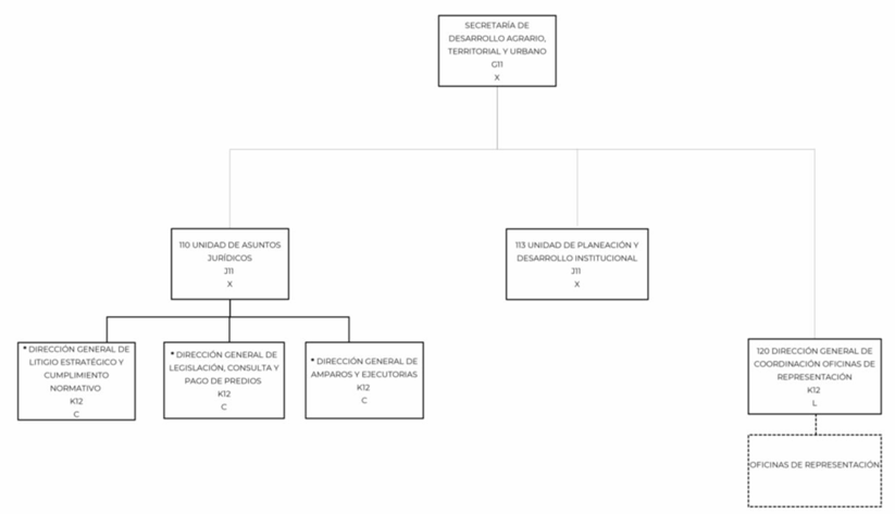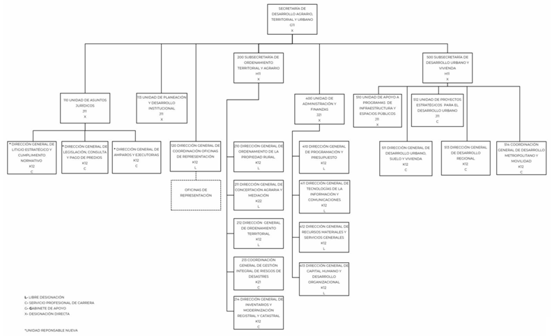 Con fecha 7 de noviembre de 2019, se publicó en el D.O.F. el nuevo Reglamento Interior de la Secretaría de Desarrollo Agrario, Territorial y Urbano, en el cual en atención a lo instruido por el Ejecutivo Federal, se suprimen de la estructura de la SEDATU las Direcciones Generales Adjuntas, así como una Subsecretaría, por lo que queda conformada con: la persona Titular de la Secretaría quien estará al frente de ella; la Subsecretaría de Ordenamiento Territorial y Agrario, con cuatro Direcciones Generales y una Coordinación General; la Subsecretaría de Desarrollo Urbano y Vivienda con dos Unidades Administrativas, una Coordinación General y dos Direcciones Generales; la Unidad de Administración y Finanzas con cuatro Direcciones Generales; la Unidad de Asuntos Jurídicos con tres Direcciones Generales; la Unidad de Planeación y Desarrollo Institucional y la Dirección General de Coordinación de Oficinas de Representación con lo que desaparece la figura de Delegaciones, dando lugar a las Oficinas de Representación en las Entidades Federativas o Regiones, de esta Secretaría.