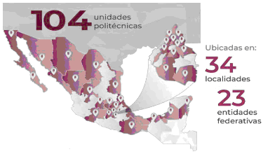 El Politécnico cuenta con 104 Unidades, tanto Académicas como de Apoyo y Vinculadas, además de Centros de Investigación que se ubican en 34 localidades de 23 Estados de la República Mexicana, distribuidas de la siguiente manera: