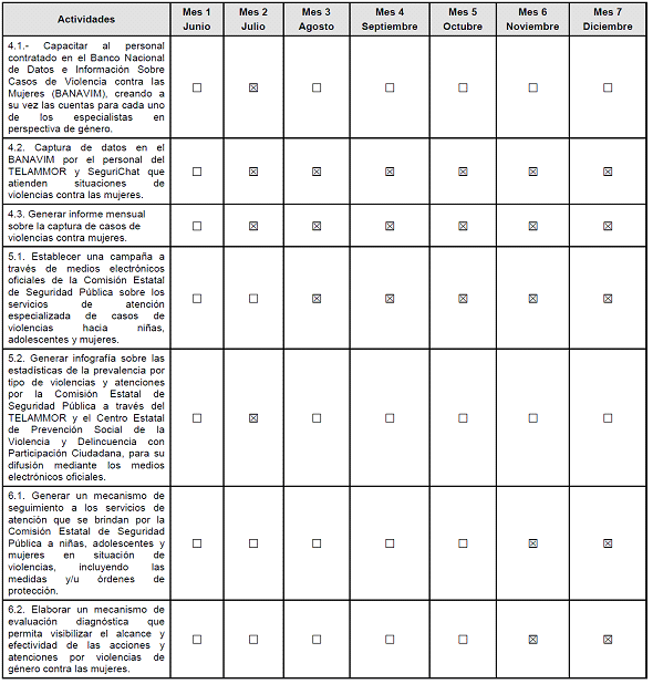 | 6.- Diseño e implementación de un modelo de seguimiento y evaluación de los servicios de la Comisión Estatal de Seguridad Pública para la atención de casos de violencias hacia niñas, adolescentes y mujeres | 6.1. Generar un mecanismo de seguimiento a los servicios de atención que se brindan por la Comisión Estatal de Seguridad Pública a niñas, adolescentes y mujeres en situación de violencias, incluyendo las medidas y/u órdenes de protección. 6.2. Elaborar un mecanismo de evaluación diagnóstica que permita visibilizar el alcance y efectividad de las acciones y atenciones por violencias de género contra las mujeres. | Mecanismo de seguimiento y evaluación diagnóstica generados sobre situaciones de violencias de género contra las mujeres a través del TELAMMOR y SeguriChat. | 10.- Informe sobre los mecanismos generados para el seguimiento y evaluación de las acciones y atenciones del TELAMMOR y SeguriChat por violencias de género contra las mujeres. |