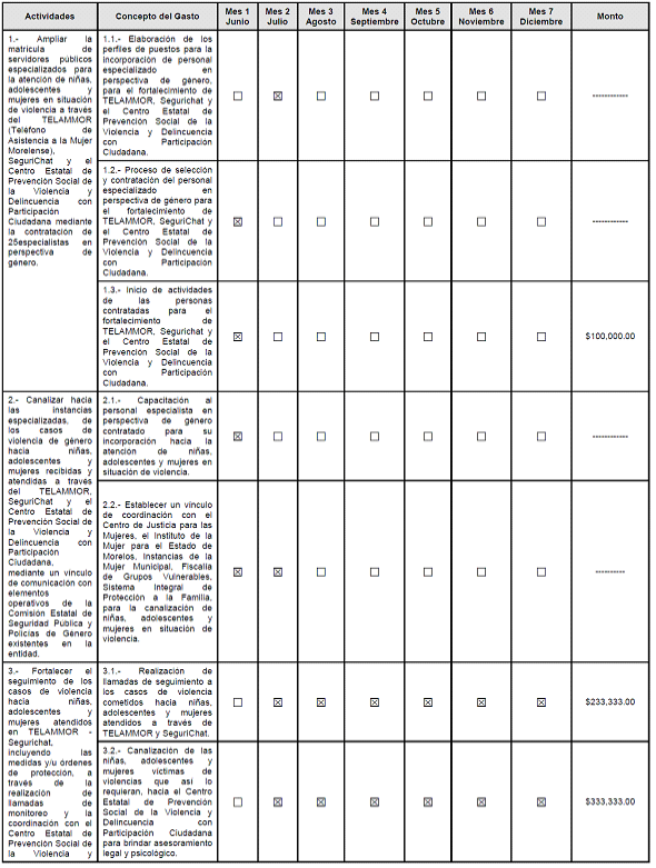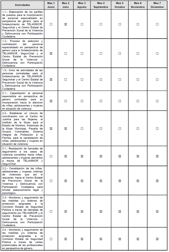 | 1.- Ampliar la matrícula de servidores públicos especializados para la atención de niñas, adolescentes y mujeres en situación de violencia a través del TELAMMOR (Teléfono de Asistencia a la Mujer Morelense), SeguriChat y el Centro Estatal de Prevención Social de la Violencia y Delincuencia con Participación Ciudadana mediante la contratación de especialistas 25 en perspectiva de género. | 1.1.- Elaboración de los perfiles de puestos para la incorporación de personal especializado en perspectiva de género, para el fortalecimiento de TELAMMOR, Segurichat y el Centro Estatal de Prevención Social de la Violencia y Delincuencia con Participación Ciudadana. 1.2.- Proceso de selección y contratación del personal especializado en perspectiva de género para el fortalecimiento de TELAMMOR, SeguriChat y el Centro Estatal de Prevención Social de la Violencia y Delincuencia con Participación Ciudadana. 1.3.- Inicio de actividades de las personas contratadas para el fortalecimiento de TELAMMOR, Segurichat y el Centro Estatal de Prevención Social de la Violencia y Delincuencia con Participación Ciudadana. | Perfiles de puestos elaborados para la contratación del personal especializado en perspectiva de género que atenderá casos de violencias hacia niñas, adolescentes y mujeres a través de TELAMMOR y SeguriChat, así como el fomento de actividades para la prevención y atención de la violencia de género contra niñas, adolescentes y mujeres a través del Centro Estatal de Prevención Social de la Violencia y Delincuencia con Participación Ciudadana. Número de personas especialistas en perspectiva de género contratadas para la atención de casos de violencias hacia niñas y mujeres a través de TELAMMOR y SeguriChat, así como el fomento de actividades para la prevención y atención de la violencia de género contra niñas, adolescentes y mujeres a través del Centro Estatal de Prevención Social de la Violencia y Delincuencia con Participación Ciudadana. Número de personas atendidas y canalizadas por el personal para el fortalecimiento del TELAMMOR, Segurichat y el Centro Estatal de Prevención Social de la Violencia y Delincuencia con Participación Ciudadana. | 1.-Perfiles elaborados del personal que atiende casos de violencias hacia niñas, adolescentes y mujeres a través de TELAMMOR y SeguriChat, así como el fomento de actividades para la prevención y atención de la violencia de género contra niñas, adolescentes y mujeres a través del Centro Estatal de Prevención Social de la Violencia y Delincuencia con Participación Ciudadana. 2.-Registros actualizados del personal especialista en perspectiva de género que se encuentran para la atención de casos de violencias hacia niñas y mujeres en el TELAMMOR, SeguriChat y el Centro Estatal de Prevención Social de la Violencia y Delincuencia con Participación Ciudadana. 3.- Reporte mensual de actividades realizadas por las personas para el fortalecimiento del TELAMMOR, Segurichat y el Centro Estatal de Prevención Social de la Violencia y Delincuencia con Participación Ciudadana. |