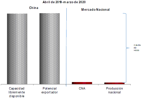 g. China dispone de una capacidad libremente disponible y un potencial de exportación de lámina rolada en frío objeto de examen considerablemente mayor al mercado nacional. En particular, el potencial exportador del periodo abril de 2019-marzo de 2020 fue equivalente a más de 30 y 55 veces el tamaño del CNA y del consumo interno, respectivamente, y más de 40 veces la producción nacional del mismo periodo.