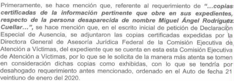Mediante minuta con registro 2475, el Asesor Jurídico Federal de la Comisión Ejecutiva de Atención a Víctimas, en acatamiento a lo requerido el veintiuno de enero del año pasado, informó que en el escrito inicial de demanda se adjuntaron copias certificadas del expediente que se encuentra en esa comisión en relación a la persona desaparecida de nombre Miguel Ángel Rodríguez Cuellar.