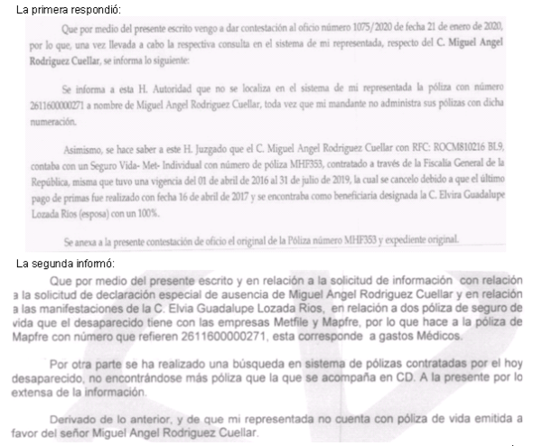 · Agente del Ministerio Público de la Federación (licenciada Miriam Grissel Navarrete Consuelos), adscrita a la Agencia Quincuagésima Sexta Investigadora de UEIDMS de la Subprocuraduría Especializada en Investigación de Delincuencia Organizada, copias certificadas de la carpeta de investigación FED/SEIDO/UEIDMS- DMX/0000057/2017, al efecto comunicó: · Las aseguradoras Metlife y MAPFRE, informaron dentro del plazo de cinco días, contados a partir de que recibieron el oficio correspondiente, para que remitieran copias certificadas de las pólizas MHF353 y 2611600000271 respectivamente, así como de los contratos que dieron origen a las mismas.