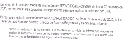· Para verificar si dentro del patrimonio del desaparecido existen bienes inmuebles, se requirió al Director del Registro Público de la Propiedad y de Comercio de la Ciudad de México, para en el lapso de cinco días informara si existe algún bien raíz a nombre de Miguel Ángel Rodríguez Cuellar, al efecto respondió: