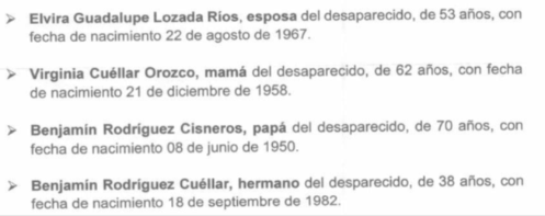 Este requisito fue igualmente cumplido, toda vez que como se vio, la promovente exhibió para acreditar el lazo filial y consanguíneo con las personas que se dice desaparecida, constancia de las actas de matrimonio y nacimiento números 325, 7077, 187 y 10985, de las que se advierte de la primera el lazo filial Elvira Guadalupe Lozada Ríos y Miguel Ángel Rodríguez Cuellar, y de las restantes se advierte el parentesco consanguíneo con Virginia Cuellar Orozco (mamá), Benjamín Rodríguez Cisneros (papá) y Benjamín Rodríguez Cuéllar (hermano), de las que se advierte: