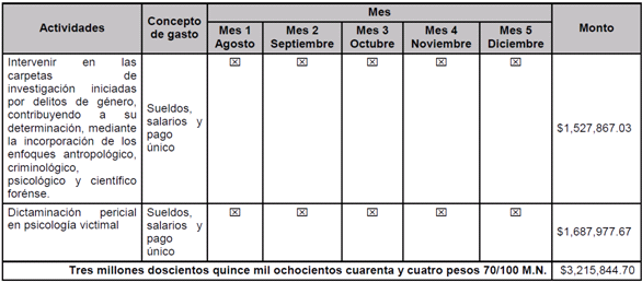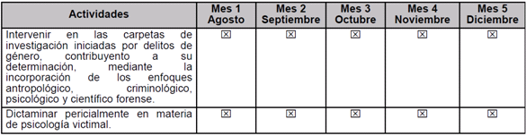 | Coadyuvar al avance en la integración de las carpetas de investigación mediante la intervención de equipos de profesionales multidisciplinarios. | Intervenir en las carpetas de investigación iniciadas por delitos de género, contribuyento a su deteminación, mediante la incorporación de los enfoques antropológico, criminológico, psicológico y científico forense. | Capacidad de producción por células de trabajo. Total de análisis realizados/número de células de operación. | Informe mensual y final de actividades. |