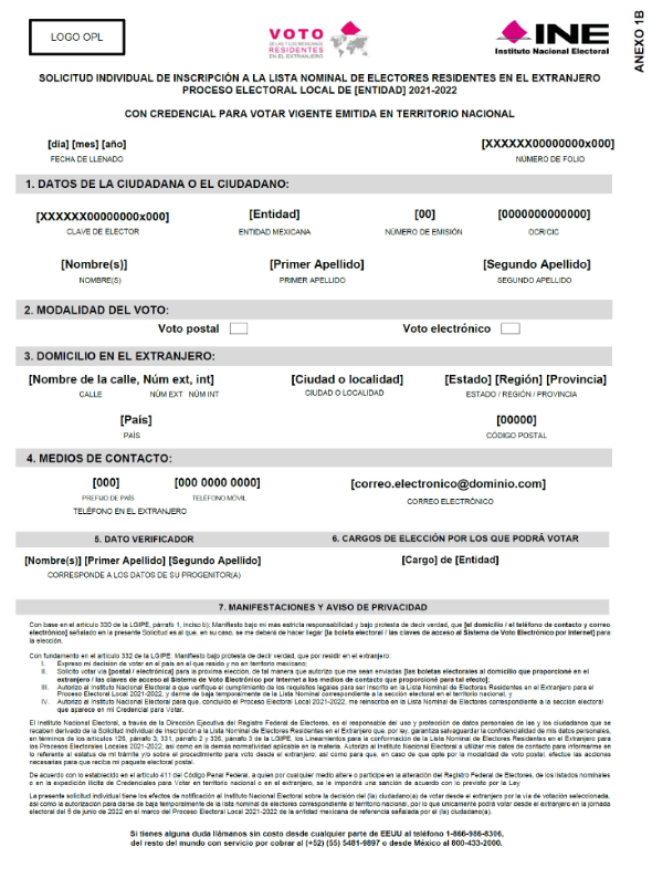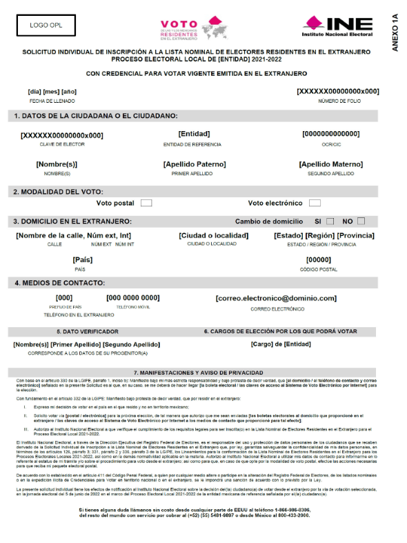 En esta dirección, el artículo 332, párrafo 1 de la LGIPE, advierte que la solicitud de inscripción en la sección del Padrón Electoral de las y los ciudadanos residentes en el extranjero, tendrá efectos legales de notificación al INE de la decisión de la o el ciudadano de votar desde el extranjero en la elección para la Presidencia de los Estados Unidos Mexicanos, Senadurías, Gubernaturas de las entidades y Jefatura de Gobierno de la Ciudad de México, siempre que así lo determinen las Constituciones de los estados. Para tal efecto, el respectivo formato contendrá la siguiente leyenda: