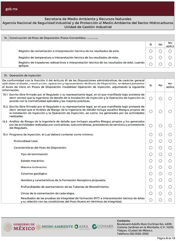 Artículo 8o. Los Regulados deberán observar las mejores prácticas y estándares nacionales e internacionales para la Construcción de Pozo de Disposición, Operación de Inyección y Taponamiento.