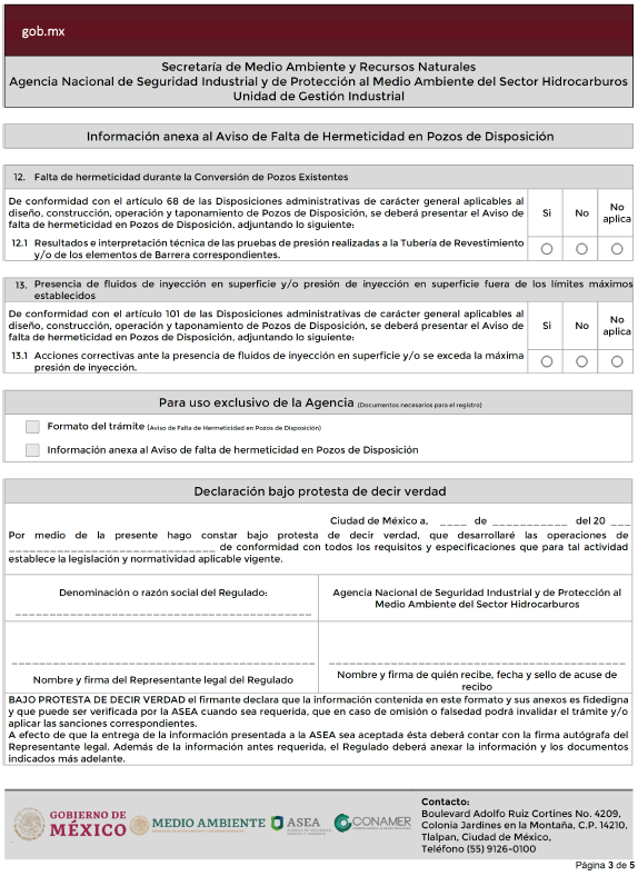 Artículo 101. Cuando se determine la presencia de fluidos de inyección en superficie y/o se exceda la máxima presión de inyección, los Regulados deberán suspender todas las operaciones en el Pozo de Disposición y realizar las acciones correctivas necesarias, así como, presentar a la Agencia de forma física o electrónica durante los cinco días hábiles posteriores a la ocurrencia de dicho acontecimiento, el Aviso de falta de hermeticidad en Pozos de Disposición, de conformidad con el formato FF-ASEA-043.